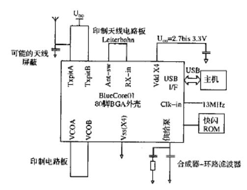 目前所有藍牙系統中天線的接收機╱發射機之間的高頻功能元件不是安在芯片上的。BlueCore模塊也不例外,但整個芯片是用CMOS技術制造的,接收機具有比雙極技術制造的設備的線性高得多,所以對濾波器實現較簡單。