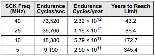 FeRAM存儲器具有讀取和還原機制。因此,對于存儲陣列的每次訪問(讀取或寫入),將按行施加耐久周期。 FRAM體系結構基于每個64位的16K行的行和列的陣列。整個行在內部訪問一次,無論是讀取還是寫入一個字節或全部八個字節。在耐久性計算中,該行中的每個字節僅被計數一次。下圖顯示了一個64字節重復循環的耐久性計算,該循環包括一個操作碼,一個起始地址和一個順序的64字節數據流。這將導致每個字節在整個循環中經歷一個持久周期。即使在40 MHz時鐘速率下,FRAM的讀寫持久性實際上也是無限的。