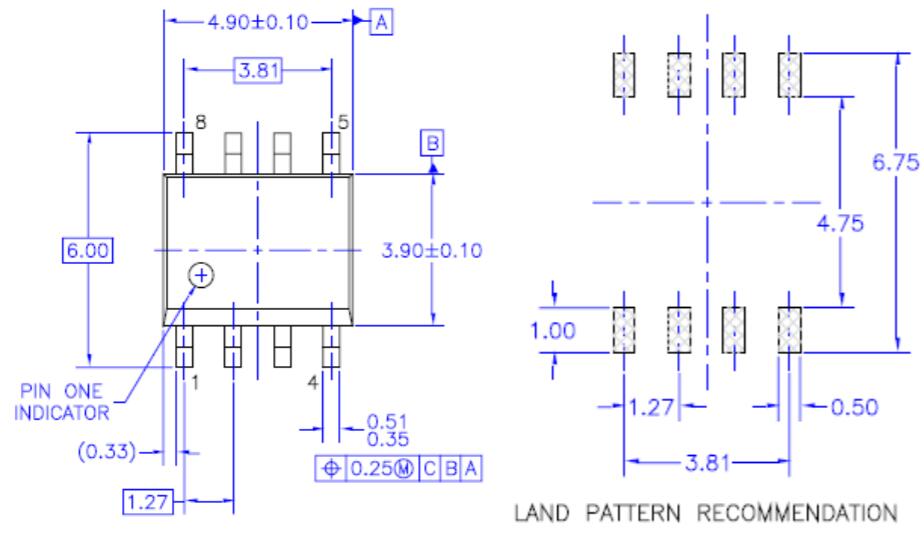 圖1代表了JEDEC標(biāo)準(zhǔn)SOIC-8封裝的近似尺寸和建議的PCB焊盤圖案(注意:以下尺寸為近似值,可能因供應(yīng)商而異)