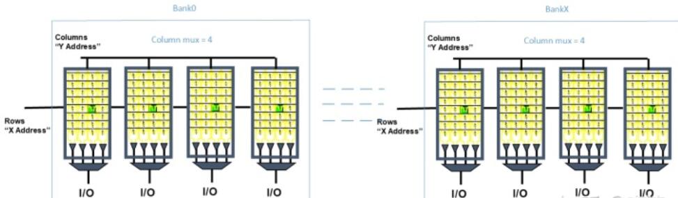 這些SRAM cell集合成如下圖的多個bank的memory block,每個bank有bank address使能;在一個bank內Row address選擇一個完整的wordline,Column address選擇某組IO bitlines。