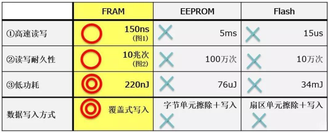 富士通FRAM主要具備三大優勢:高讀寫入耐久性、高速寫入以及低功耗,這是絕大多數同類型存儲器無法比擬的。比如FRAM寫入次數壽命高達10萬億次,而EEPROM僅有百萬次(10^6)。