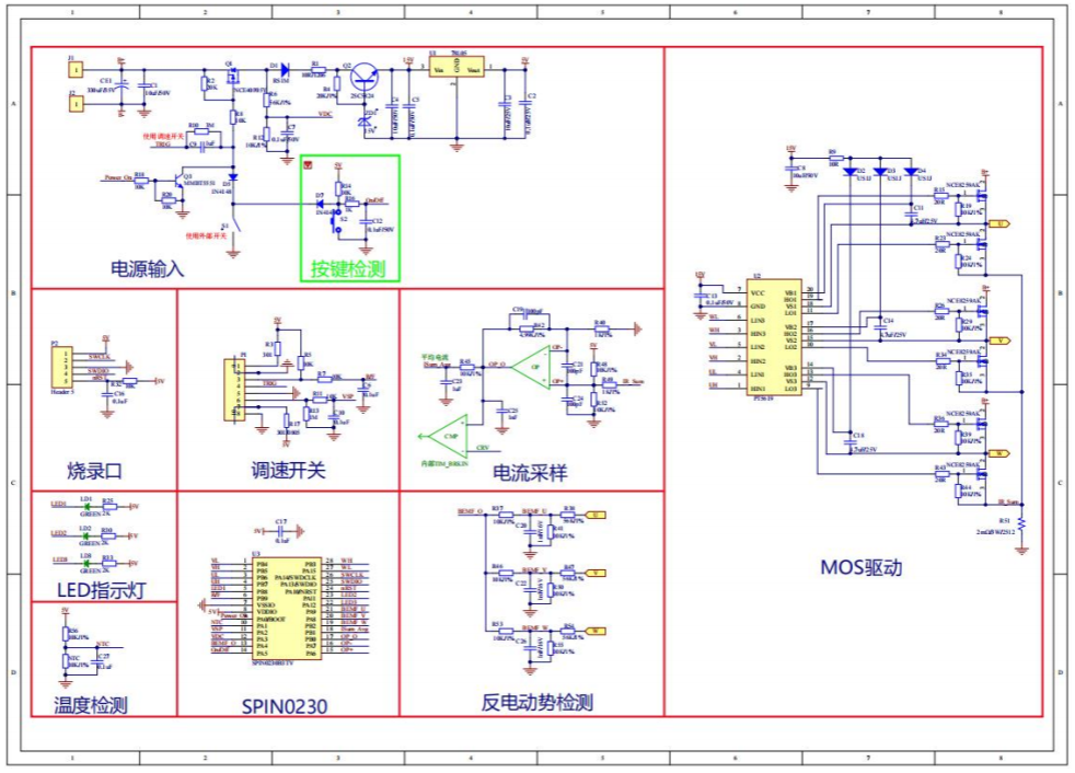 -通過反電動勢分壓電路檢測過零點(diǎn)信號得到位置信息,對應(yīng)六種不同的逆變器MOS管驅(qū)動順序,實(shí)現(xiàn)BLDC電機(jī)的六步換相。
